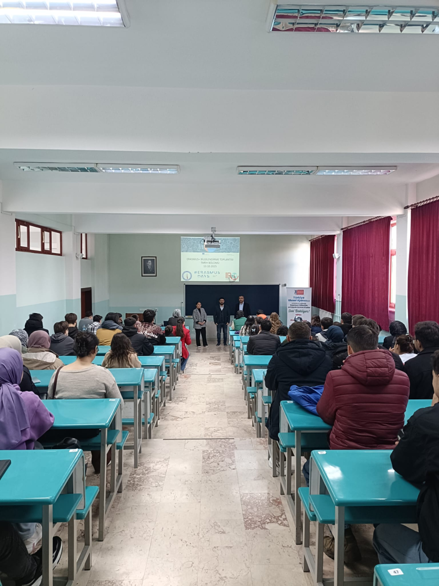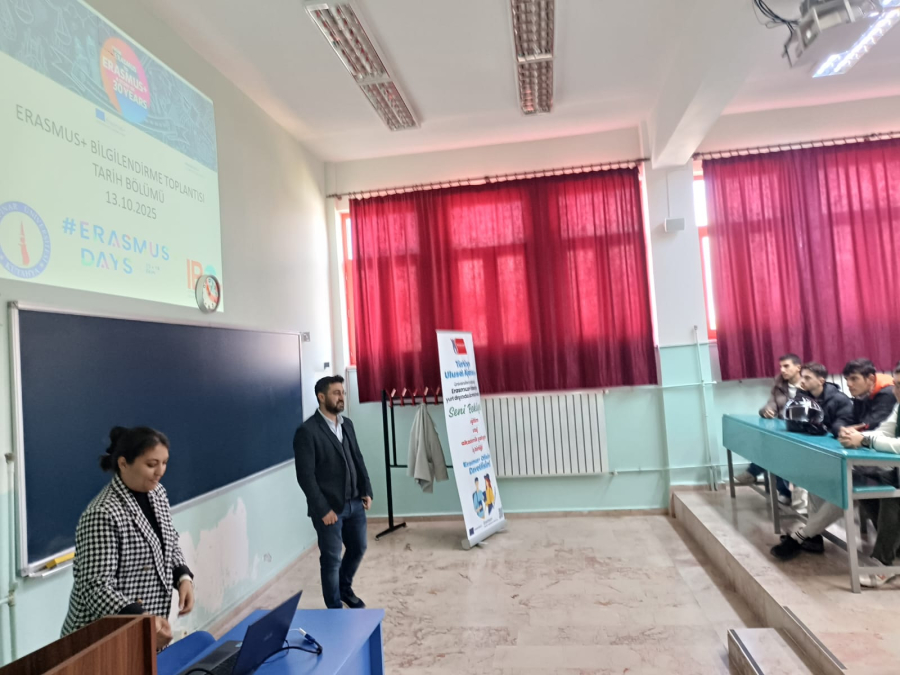 2025-2026 Eğitim Öğretim Yılı Tarih Bölümü ERASMUS+ Bilgilendirme Toplantısı 13.10. 2025 saat 11:00-12:00 saatleri arasında Tarih Bölümünün C 202 kodlu salonunda Öğr. Gör. Elif Körpe ve Öğr. Gör. Dr. Hasan Yiğit’in sunumlarıyla gerçekleştirildi.